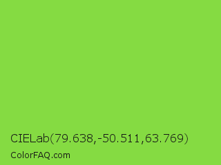 CIELab 79.638,-50.511,63.769 Color is a normal green color and the nearest color is Kiwi #8ee53f. Hex code #85db42 and RGB value is rgb(133,219,66). In RGB color space, this color is composed of 52% red, 86% green, 26% blue, In CMYK color space, this color is composed of 39% cyan, 0% magenta, 70% yellow , 14% black , In HSL color space, this color has a hue angle of 94° , 68% saturation and 56% lightness.