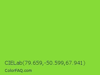 CIELab 79.659,-50.599,67.941 Color is a normal green color and the nearest color is Kiwi #8ee53f. Hex code #87db36 and RGB value is rgb(135,219,54). In RGB color space, this color is composed of 53% red, 86% green, 21% blue, In CMYK color space, this color is composed of 38% cyan, 0% magenta, 75% yellow , 14% black , In HSL color space, this color has a hue angle of 91° , 70% saturation and 54% lightness.