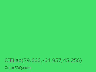 CIELab 79.666,-64.957,45.256 Color is a normal green color and the nearest color is UFO Green #3cd070. Hex code #42e16c and RGB value is rgb(66,225,108). In RGB color space, this color is composed of 26% red, 88% green, 42% blue, In CMYK color space, this color is composed of 71% cyan, 0% magenta, 52% yellow , 12% black , In HSL color space, this color has a hue angle of 136° , 73% saturation and 57% lightness.