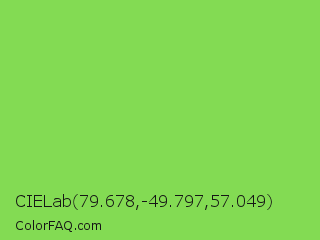 CIELab 79.678,-49.797,57.049 Color is a normal green color and the nearest color is Kiwi #8ee53f. Hex code #83db53 and RGB value is rgb(131,219,83). In RGB color space, this color is composed of 51% red, 86% green, 33% blue, In CMYK color space, this color is composed of 40% cyan, 0% magenta, 62% yellow , 14% black , In HSL color space, this color has a hue angle of 99° , 65% saturation and 59% lightness.