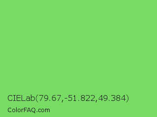 CIELab 79.67,-51.822,49.384 Color is a light green color and the nearest color is Pastel Green #77dd77. Hex code #78dc64 and RGB value is rgb(120,220,100). In RGB color space, this color is composed of 47% red, 86% green, 39% blue, In CMYK color space, this color is composed of 45% cyan, 0% magenta, 55% yellow , 14% black , In HSL color space, this color has a hue angle of 110° , 63% saturation and 63% lightness.