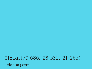CIELab 79.686,-28.531,-21.265 Color is a light cyan color and the nearest color is Turquoise Blue #6cdae7. Hex code #56d6ec and RGB value is rgb(86,214,236). In RGB color space, this color is composed of 34% red, 84% green, 93% blue, In CMYK color space, this color is composed of 64% cyan, 9% magenta, 0% yellow , 7% black , In HSL color space, this color has a hue angle of 189° , 80% saturation and 63% lightness.