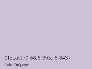 CIELab 79.68,8.395,-8.843 Color is a light purple color and the nearest color is Maverick #d8c2d5. Hex code #cec1d6 and RGB value is rgb(206,193,214). In RGB color space, this color is composed of 81% red, 76% green, 84% blue, In CMYK color space, this color is composed of 4% cyan, 10% magenta, 0% yellow , 16% black , In HSL color space, this color has a hue angle of 277° , 20% saturation and 80% lightness.