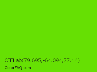CIELab 79.695,-64.094,77.14 Color is a normal green color and the nearest color is Alien Armpit #84de02. Hex code #66e003 and RGB value is rgb(102,224,3). In RGB color space, this color is composed of 40% red, 88% green, 1% blue, In CMYK color space, this color is composed of 54% cyan, 0% magenta, 99% yellow , 12% black , In HSL color space, this color has a hue angle of 93° , 97% saturation and 45% lightness.