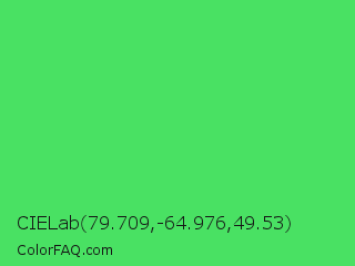 CIELab 79.709,-64.976,49.53 Color is a normal green color and the nearest color is UFO Green #3cd070. Hex code #49e163 and RGB value is rgb(73,225,99). In RGB color space, this color is composed of 29% red, 88% green, 39% blue, In CMYK color space, this color is composed of 68% cyan, 0% magenta, 56% yellow , 12% black , In HSL color space, this color has a hue angle of 130° , 72% saturation and 58% lightness.