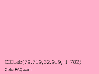 CIELab 79.719,32.919,-1.782 Color is a very light rose color and the nearest color is Lavender Pink #fbaed2. Hex code #ffafca and RGB value is rgb(255,175,202). In RGB color space, this color is composed of 100% red, 69% green, 79% blue, In CMYK color space, this color is composed of 0% cyan, 31% magenta, 21% yellow , 0% black , In HSL color space, this color has a hue angle of 340° , 100% saturation and 84% lightness.