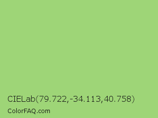 CIELab 79.722,-34.113,40.758 Color is a light green color and the nearest color is Pistachio #93c572. Hex code #9ed577 and RGB value is rgb(158,213,119). In RGB color space, this color is composed of 62% red, 84% green, 47% blue, In CMYK color space, this color is composed of 26% cyan, 0% magenta, 44% yellow , 16% black , In HSL color space, this color has a hue angle of 95° , 53% saturation and 65% lightness.