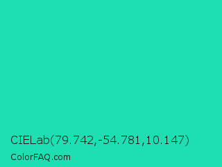 CIELab 79.742,-54.781,10.147 Color is a normal cyan color and the nearest color is Turquoise PWG #30d5c8. Hex code #1edfb1 and RGB value is rgb(30,223,177). In RGB color space, this color is composed of 12% red, 87% green, 69% blue, In CMYK color space, this color is composed of 87% cyan, 0% magenta, 21% yellow , 13% black , In HSL color space, this color has a hue angle of 166° , 76% saturation and 50% lightness.