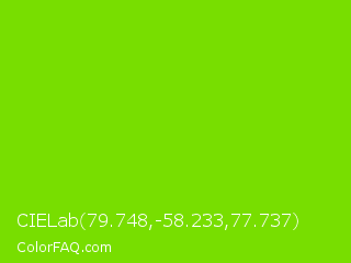 CIELab 79.748,-58.233,77.737 Color is a normal green color and the nearest color is Alien Armpit #84de02. Hex code #78de00 and RGB value is rgb(120,222,0). In RGB color space, this color is composed of 47% red, 87% green, 0% blue, In CMYK color space, this color is composed of 46% cyan, 0% magenta, 100% yellow , 13% black , In HSL color space, this color has a hue angle of 88° , 100% saturation and 44% lightness.