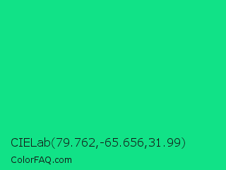 CIELab 79.762,-65.656,31.99 Color is a normal green color and the nearest color is Caribbean Green #00cc99. Hex code #11e287 and RGB value is rgb(17,226,135). In RGB color space, this color is composed of 7% red, 89% green, 53% blue, In CMYK color space, this color is composed of 92% cyan, 0% magenta, 40% yellow , 11% black , In HSL color space, this color has a hue angle of 154° , 86% saturation and 48% lightness.
