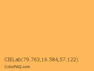 CIELab 79.763,16.584,57.122 Color is a light orange color and the nearest color is Texas Rose #ffb555. Hex code #ffb859 and RGB value is rgb(255,184,89). In RGB color space, this color is composed of 100% red, 72% green, 35% blue, In CMYK color space, this color is composed of 0% cyan, 28% magenta, 65% yellow , 0% black , In HSL color space, this color has a hue angle of 34° , 100% saturation and 67% lightness.