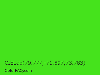 CIELab 79.777,-71.897,73.783 Color is a normal green color and the nearest color is Harlequin Green #46cb18. Hex code #45e31c and RGB value is rgb(69,227,28). In RGB color space, this color is composed of 27% red, 89% green, 11% blue, In CMYK color space, this color is composed of 70% cyan, 0% magenta, 88% yellow , 11% black , In HSL color space, this color has a hue angle of 108° , 78% saturation and 50% lightness.