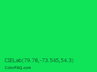 CIELab 79.78,-73.545,54.3 Color is a normal green color and the nearest color is Malachite #0bda51. Hex code #0fe458 and RGB value is rgb(15,228,88). In RGB color space, this color is composed of 6% red, 89% green, 35% blue, In CMYK color space, this color is composed of 93% cyan, 0% magenta, 61% yellow , 11% black , In HSL color space, this color has a hue angle of 141° , 88% saturation and 48% lightness.