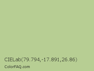 CIELab 79.794,-17.891,26.86 Color is a light green color and the nearest color is Pine Glade #c7cd90. Hex code #b7ce93 and RGB value is rgb(183,206,147). In RGB color space, this color is composed of 72% red, 81% green, 58% blue, In CMYK color space, this color is composed of 11% cyan, 0% magenta, 29% yellow , 19% black , In HSL color space, this color has a hue angle of 83° , 38% saturation and 69% lightness.