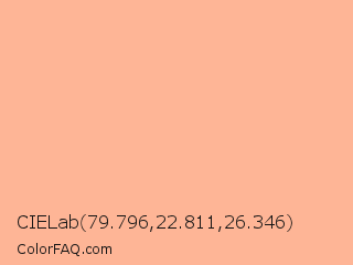 CIELab 79.796,22.811,26.346 Color is a light orange color and the nearest color is Rose Bud #fbb2a3. Hex code #feb596 and RGB value is rgb(254,181,150). In RGB color space, this color is composed of 100% red, 71% green, 59% blue, In CMYK color space, this color is composed of 0% cyan, 29% magenta, 41% yellow , 0% black , In HSL color space, this color has a hue angle of 18° , 98% saturation and 79% lightness.