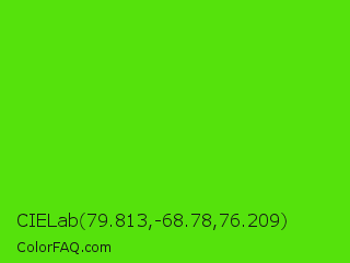 CIELab 79.813,-68.78,76.209 Color is a normal green color and the nearest color is Harlequin Green #46cb18. Hex code #55e20c and RGB value is rgb(85,226,12). In RGB color space, this color is composed of 33% red, 89% green, 5% blue, In CMYK color space, this color is composed of 62% cyan, 0% magenta, 95% yellow , 11% black , In HSL color space, this color has a hue angle of 100° , 90% saturation and 47% lightness.