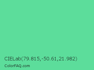 CIELab 79.815,-50.61,21.982 Color is a light green color and the nearest color is Medium Aquamarine #66ddaa. Hex code #5cdd9b and RGB value is rgb(92,221,155). In RGB color space, this color is composed of 36% red, 87% green, 61% blue, In CMYK color space, this color is composed of 58% cyan, 0% magenta, 30% yellow , 13% black , In HSL color space, this color has a hue angle of 149° , 65% saturation and 61% lightness.