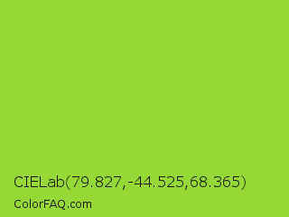 CIELab 79.827,-44.525,68.365 Color is a normal green color and the nearest color is Yellow Green #9acd32. Hex code #96d936 and RGB value is rgb(150,217,54). In RGB color space, this color is composed of 59% red, 85% green, 21% blue, In CMYK color space, this color is composed of 31% cyan, 0% magenta, 75% yellow , 15% black , In HSL color space, this color has a hue angle of 85° , 68% saturation and 53% lightness.