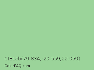 CIELab 79.834,-29.559,22.959 Color is a light green color and the nearest color is Granny Smith Apple Crayola #9de093. Hex code #9bd49a and RGB value is rgb(155,212,154). In RGB color space, this color is composed of 61% red, 83% green, 60% blue, In CMYK color space, this color is composed of 27% cyan, 0% magenta, 27% yellow , 17% black , In HSL color space, this color has a hue angle of 119° , 40% saturation and 72% lightness.