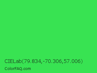 CIELab 79.834,-70.306,57.006 Color is a normal green color and the nearest color is UFO Green #3cd070. Hex code #38e352 and RGB value is rgb(56,227,82). In RGB color space, this color is composed of 22% red, 89% green, 32% blue, In CMYK color space, this color is composed of 75% cyan, 0% magenta, 64% yellow , 11% black , In HSL color space, this color has a hue angle of 129° , 75% saturation and 55% lightness.