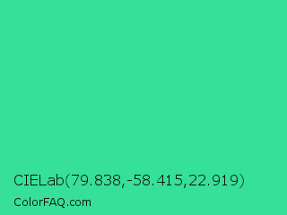 CIELab 79.838,-58.415,22.919 Color is a normal green color and the nearest color is Shamrock #33cc99. Hex code #36e099 and RGB value is rgb(54,224,153). In RGB color space, this color is composed of 21% red, 88% green, 60% blue, In CMYK color space, this color is composed of 76% cyan, 0% magenta, 32% yellow , 12% black , In HSL color space, this color has a hue angle of 155° , 73% saturation and 55% lightness.