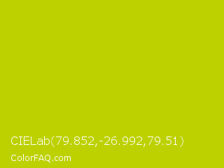 CIELab 79.852,-26.992,79.51 Color is a normal yellow color and the nearest color is Rio Grande #bbd009. Hex code #bdd100 and RGB value is rgb(189,209,0). In RGB color space, this color is composed of 74% red, 82% green, 0% blue, In CMYK color space, this color is composed of 10% cyan, 0% magenta, 100% yellow , 18% black , In HSL color space, this color has a hue angle of 66° , 100% saturation and 41% lightness.