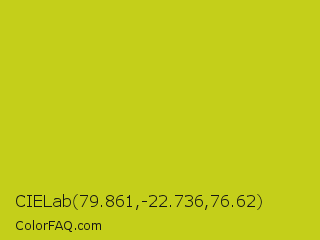 CIELab 79.861,-22.736,76.62 Color is a normal yellow color and the nearest color is Key Lime Pie #bfc921. Hex code #c4cf1a and RGB value is rgb(196,207,26). In RGB color space, this color is composed of 77% red, 81% green, 10% blue, In CMYK color space, this color is composed of 5% cyan, 0% magenta, 87% yellow , 19% black , In HSL color space, this color has a hue angle of 64° , 78% saturation and 46% lightness.