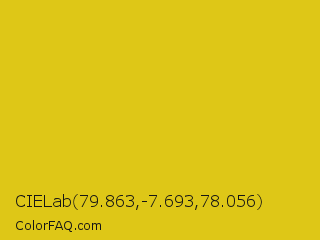 CIELab 79.863,-7.693,78.056 Color is a normal yellow color and the nearest color is Bird Flower #d4cd16. Hex code #dec717 and RGB value is rgb(222,199,23). In RGB color space, this color is composed of 87% red, 78% green, 9% blue, In CMYK color space, this color is composed of 0% cyan, 10% magenta, 90% yellow , 13% black , In HSL color space, this color has a hue angle of 53° , 81% saturation and 48% lightness.