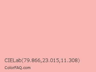 CIELab 79.866,23.015,11.308 Color is a very light red color and the nearest color is Melon #fdbcb4. Hex code #f7b6b2 and RGB value is rgb(247,182,178). In RGB color space, this color is composed of 97% red, 71% green, 70% blue, In CMYK color space, this color is composed of 0% cyan, 26% magenta, 28% yellow , 3% black , In HSL color space, this color has a hue angle of 3° , 81% saturation and 83% lightness.
