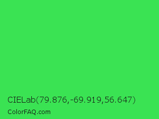 CIELab 79.876,-69.919,56.647 Color is a normal green color and the nearest color is UFO Green #3cd070. Hex code #3ae353 and RGB value is rgb(58,227,83). In RGB color space, this color is composed of 23% red, 89% green, 33% blue, In CMYK color space, this color is composed of 74% cyan, 0% magenta, 63% yellow , 11% black , In HSL color space, this color has a hue angle of 129° , 75% saturation and 56% lightness.