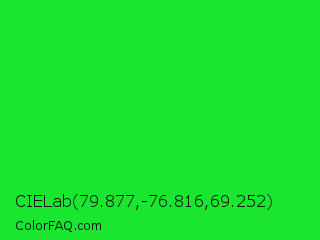 CIELab 79.877,-76.816,69.252 Color is a normal green color and the nearest color is Lime Green #32cd32. Hex code #1ae52f and RGB value is rgb(26,229,47). In RGB color space, this color is composed of 10% red, 90% green, 18% blue, In CMYK color space, this color is composed of 89% cyan, 0% magenta, 79% yellow , 10% black , In HSL color space, this color has a hue angle of 126° , 80% saturation and 50% lightness.