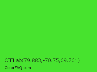 CIELab 79.883,-70.75,69.761 Color is a normal green color and the nearest color is Lime Green #32cd32. Hex code #47e32e and RGB value is rgb(71,227,46). In RGB color space, this color is composed of 28% red, 89% green, 18% blue, In CMYK color space, this color is composed of 69% cyan, 0% magenta, 80% yellow , 11% black , In HSL color space, this color has a hue angle of 112° , 76% saturation and 54% lightness.