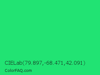 CIELab 79.897,-68.471,42.091 Color is a normal green color and the nearest color is UFO Green #3cd070. Hex code #21e373 and RGB value is rgb(33,227,115). In RGB color space, this color is composed of 13% red, 89% green, 45% blue, In CMYK color space, this color is composed of 85% cyan, 0% magenta, 49% yellow , 11% black , In HSL color space, this color has a hue angle of 145° , 78% saturation and 51% lightness.