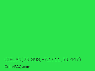 CIELab 79.898,-72.911,59.447 Color is a normal green color and the nearest color is Malachite #0bda51. Hex code #2ae44c and RGB value is rgb(42,228,76). In RGB color space, this color is composed of 16% red, 89% green, 30% blue, In CMYK color space, this color is composed of 82% cyan, 0% magenta, 67% yellow , 11% black , In HSL color space, this color has a hue angle of 131° , 78% saturation and 53% lightness.
