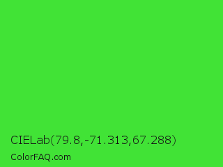 CIELab 79.8,-71.313,67.288 Color is a normal green color and the nearest color is Lime Green #32cd32. Hex code #41e336 and RGB value is rgb(65,227,54). In RGB color space, this color is composed of 25% red, 89% green, 21% blue, In CMYK color space, this color is composed of 71% cyan, 0% magenta, 76% yellow , 11% black , In HSL color space, this color has a hue angle of 116° , 76% saturation and 55% lightness.
