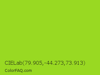 CIELab 79.905,-44.273,73.913 Color is a normal green color and the nearest color is Atlantis #97cd2d. Hex code #99d922 and RGB value is rgb(153,217,34). In RGB color space, this color is composed of 60% red, 85% green, 13% blue, In CMYK color space, this color is composed of 29% cyan, 0% magenta, 84% yellow , 15% black , In HSL color space, this color has a hue angle of 81° , 73% saturation and 49% lightness.