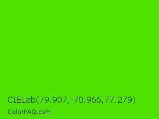 CIELab 79.907,-70.966,77.279 Color is a normal green color and the nearest color is Chlorophyll Green #4aff00. Hex code #4de300 and RGB value is rgb(77,227,0). In RGB color space, this color is composed of 30% red, 89% green, 0% blue, In CMYK color space, this color is composed of 66% cyan, 0% magenta, 100% yellow , 11% black , In HSL color space, this color has a hue angle of 100° , 100% saturation and 45% lightness.