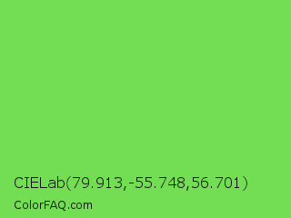 CIELab 79.913,-55.748,56.701 Color is a normal green color and the nearest color is Mantis #74c365. Hex code #73de54 and RGB value is rgb(115,222,84). In RGB color space, this color is composed of 45% red, 87% green, 33% blue, In CMYK color space, this color is composed of 48% cyan, 0% magenta, 62% yellow , 13% black , In HSL color space, this color has a hue angle of 107° , 68% saturation and 60% lightness.