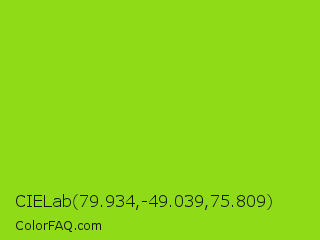 CIELab 79.934,-49.039,75.809 Color is a normal green color and the nearest color is Alien Armpit #84de02. Hex code #8fdb17 and RGB value is rgb(143,219,23). In RGB color space, this color is composed of 56% red, 86% green, 9% blue, In CMYK color space, this color is composed of 35% cyan, 0% magenta, 89% yellow , 14% black , In HSL color space, this color has a hue angle of 83° , 81% saturation and 47% lightness.