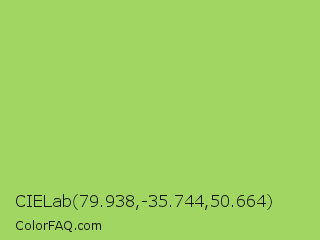 CIELab 79.938,-35.744,50.664 Color is a light green color and the nearest color is Conifer #acdd4d. Hex code #a1d663 and RGB value is rgb(161,214,99). In RGB color space, this color is composed of 63% red, 84% green, 39% blue, In CMYK color space, this color is composed of 25% cyan, 0% magenta, 54% yellow , 16% black , In HSL color space, this color has a hue angle of 88° , 58% saturation and 61% lightness.