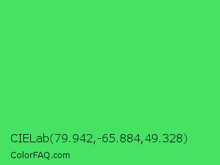 CIELab 79.942,-65.884,49.328 Color is a normal green color and the nearest color is UFO Green #3cd070. Hex code #45e264 and RGB value is rgb(69,226,100). In RGB color space, this color is composed of 27% red, 89% green, 39% blue, In CMYK color space, this color is composed of 69% cyan, 0% magenta, 56% yellow , 11% black , In HSL color space, this color has a hue angle of 132° , 73% saturation and 58% lightness.