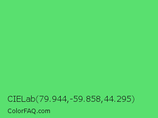 CIELab 79.944,-59.858,44.295 Color is a light green color and the nearest color is Very Light Malachite Green #64e986. Hex code #59e06f and RGB value is rgb(89,224,111). In RGB color space, this color is composed of 35% red, 88% green, 44% blue, In CMYK color space, this color is composed of 60% cyan, 0% magenta, 50% yellow , 12% black , In HSL color space, this color has a hue angle of 130° , 69% saturation and 61% lightness.