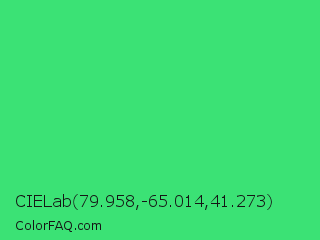 CIELab 79.958,-65.014,41.273 Color is a normal green color and the nearest color is UFO Green #3cd070. Hex code #3be275 and RGB value is rgb(59,226,117). In RGB color space, this color is composed of 23% red, 89% green, 46% blue, In CMYK color space, this color is composed of 74% cyan, 0% magenta, 48% yellow , 11% black , In HSL color space, this color has a hue angle of 141° , 74% saturation and 56% lightness.