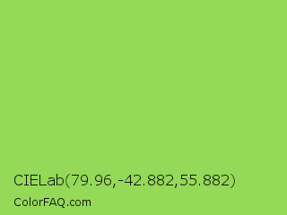 CIELab 79.96,-42.882,55.882 Color is a normal green color and the nearest color is Conifer #acdd4d. Hex code #94d957 and RGB value is rgb(148,217,87). In RGB color space, this color is composed of 58% red, 85% green, 34% blue, In CMYK color space, this color is composed of 32% cyan, 0% magenta, 60% yellow , 15% black , In HSL color space, this color has a hue angle of 92° , 63% saturation and 60% lightness.
