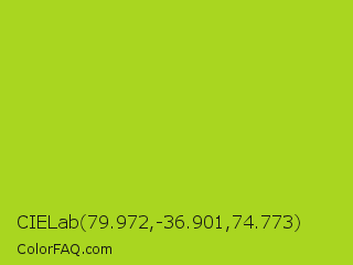 CIELab 79.972,-36.901,74.773 Color is a normal lime color and the nearest color is Inch Worm #b0e313. Hex code #a9d620 and RGB value is rgb(169,214,32). In RGB color space, this color is composed of 66% red, 84% green, 13% blue, In CMYK color space, this color is composed of 21% cyan, 0% magenta, 85% yellow , 16% black , In HSL color space, this color has a hue angle of 75° , 74% saturation and 48% lightness.