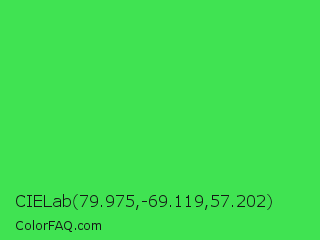 CIELab 79.975,-69.119,57.202 Color is a normal green color and the nearest color is UFO Green #3cd070. Hex code #40e352 and RGB value is rgb(64,227,82). In RGB color space, this color is composed of 25% red, 89% green, 32% blue, In CMYK color space, this color is composed of 72% cyan, 0% magenta, 64% yellow , 11% black , In HSL color space, this color has a hue angle of 127° , 74% saturation and 57% lightness.