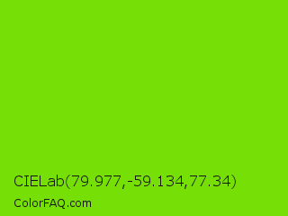 CIELab 79.977,-59.134,77.34 Color is a normal green color and the nearest color is Alien Armpit #84de02. Hex code #76df06 and RGB value is rgb(118,223,6). In RGB color space, this color is composed of 46% red, 87% green, 2% blue, In CMYK color space, this color is composed of 47% cyan, 0% magenta, 97% yellow , 13% black , In HSL color space, this color has a hue angle of 89° , 95% saturation and 45% lightness.