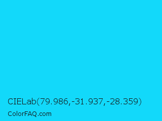 CIELab 79.986,-31.937,-28.359 Color is a normal cyan color and the nearest color is Vivid Sky Blue #00ccff. Hex code #12d9fa and RGB value is rgb(18,217,250). In RGB color space, this color is composed of 7% red, 85% green, 98% blue, In CMYK color space, this color is composed of 93% cyan, 13% magenta, 0% yellow , 2% black , In HSL color space, this color has a hue angle of 189° , 96% saturation and 53% lightness.