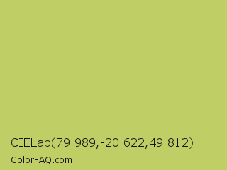 CIELab 79.989,-20.622,49.812 Color is a light yellow color and the nearest color is Wild Willow #b9c46a. Hex code #bfcf66 and RGB value is rgb(191,207,102). In RGB color space, this color is composed of 75% red, 81% green, 40% blue, In CMYK color space, this color is composed of 8% cyan, 0% magenta, 51% yellow , 19% black , In HSL color space, this color has a hue angle of 69° , 52% saturation and 61% lightness.