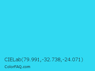 CIELab 79.991,-32.738,-24.071 Color is a normal cyan color and the nearest color is Turquoise #40e0d0. Hex code #30d9f2 and RGB value is rgb(48,217,242). In RGB color space, this color is composed of 19% red, 85% green, 95% blue, In CMYK color space, this color is composed of 80% cyan, 10% magenta, 0% yellow , 5% black , In HSL color space, this color has a hue angle of 188° , 88% saturation and 57% lightness.